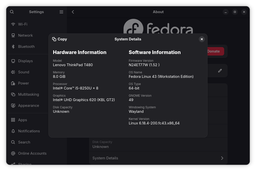 Yesterday I have replaced my aging Thinkpad T420 with something much newer: a Thinkpad T480. I mainly intend to use this laptop on a moments notice, so I decided that Fedora Linux would probably be the best bet for such a device, due to it having a pretty good track record for being stable.